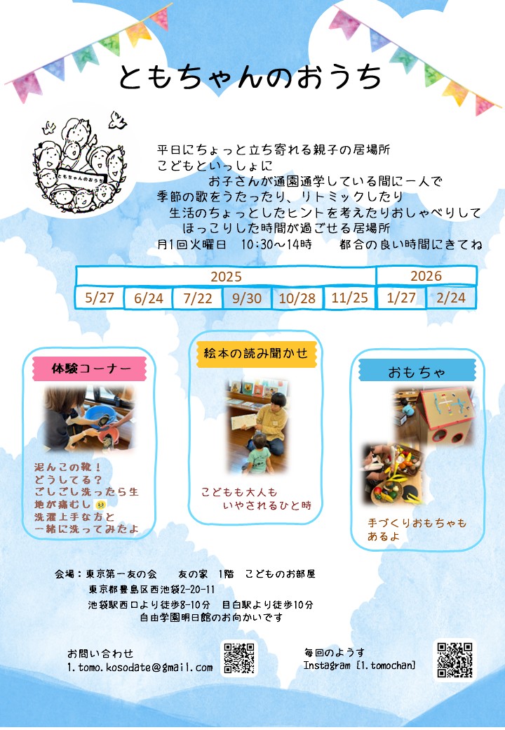 2025年度リニューアルしたともちゃんのおうち 。集まった方と、子育て経験のある友の会のスタッフと過ごす会です。月一回、火曜日10:30-14:00