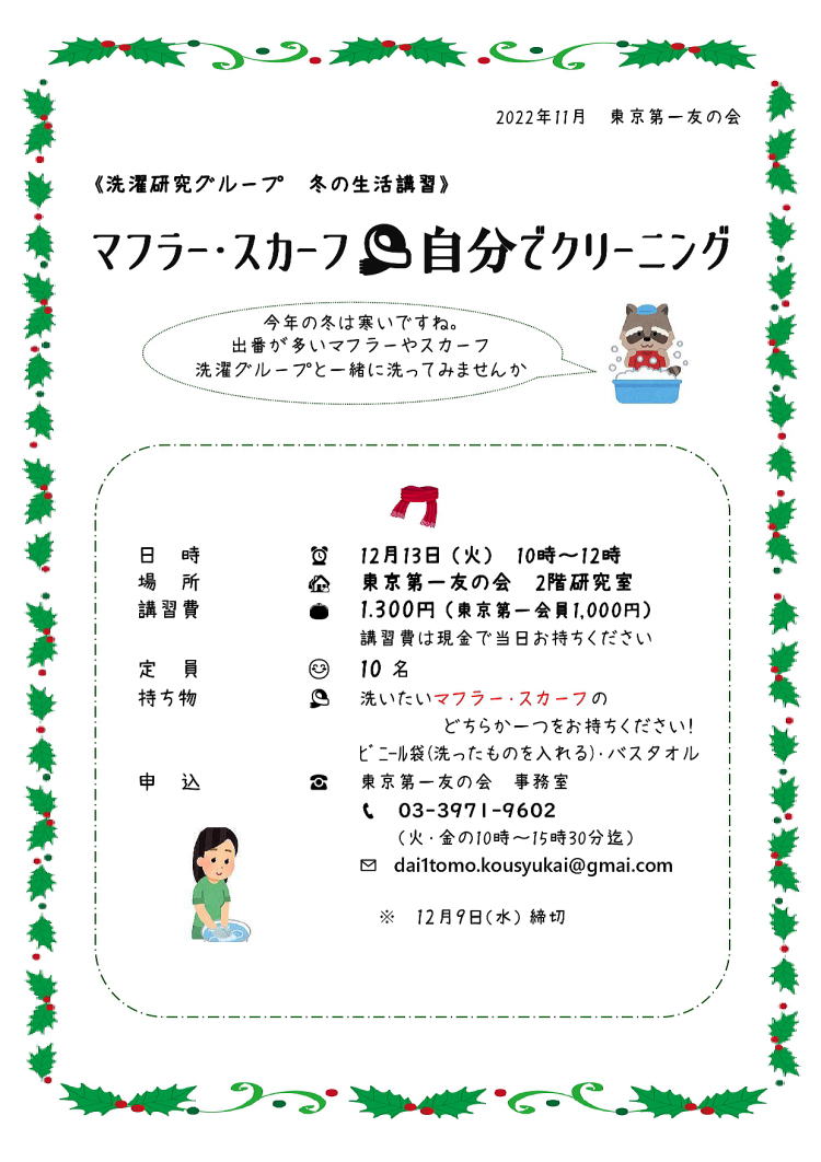12月13日(火)10時~12時、友の家において、マフラー・スカーフの洗濯講習会を行います。