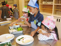 さあ、作ってみよう!上手に具をのせる女の子3人。 |