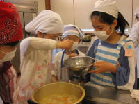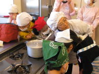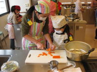 「人参はこんなふうに切ろうね」 6年生がやさしくアドバイス。 |