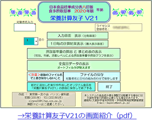 今回の「栄養計算友子V21」のバージョンアップは、日本食品標準成分表八訂版(文部科学省)、日本人の食事摂取基準2020年版(厚生労働省)に準拠したものです。